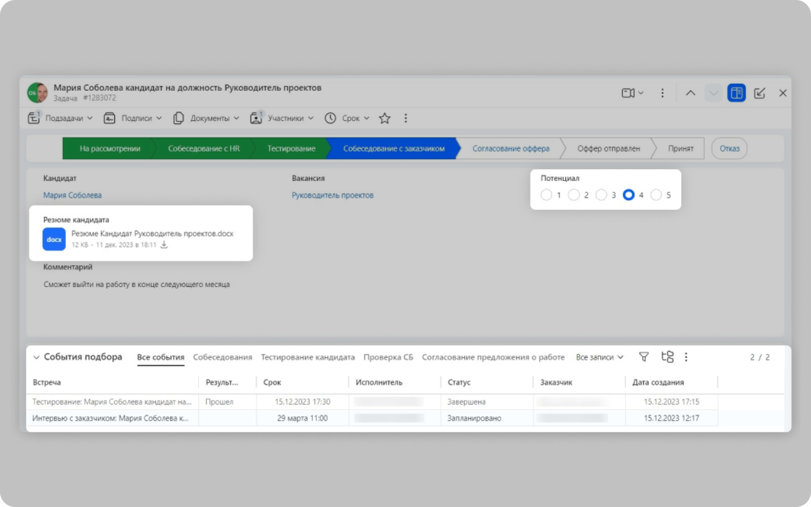 Запрашивайте фидбек согласующих, назначайте тесты кандидату, высылайте опросы и анкету прямо из системы. Настройте личный кабинет кандидата с актуальной информацией по отбору.