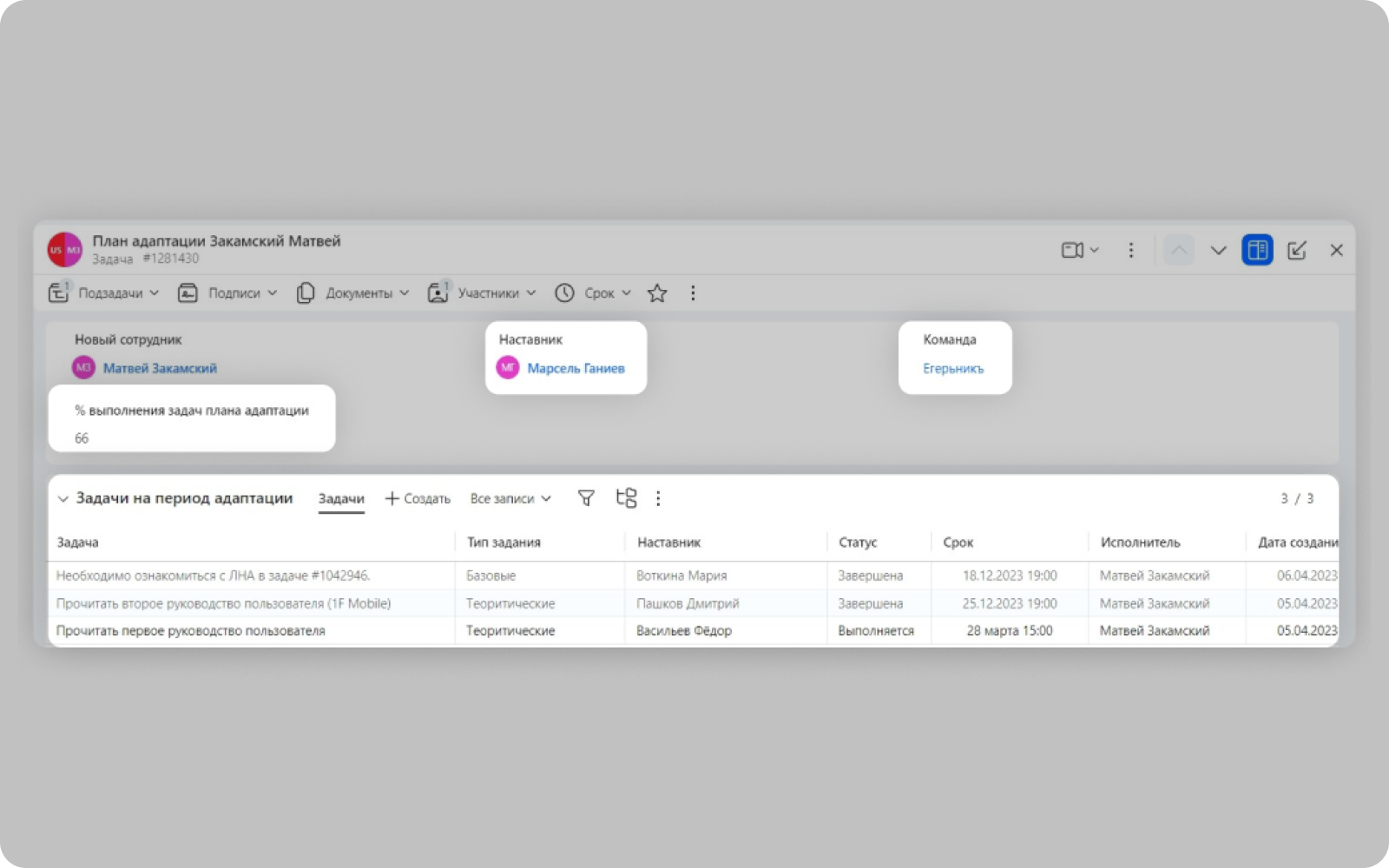 Система создаст план на период адаптации и добавит в него необходимые регламенты.