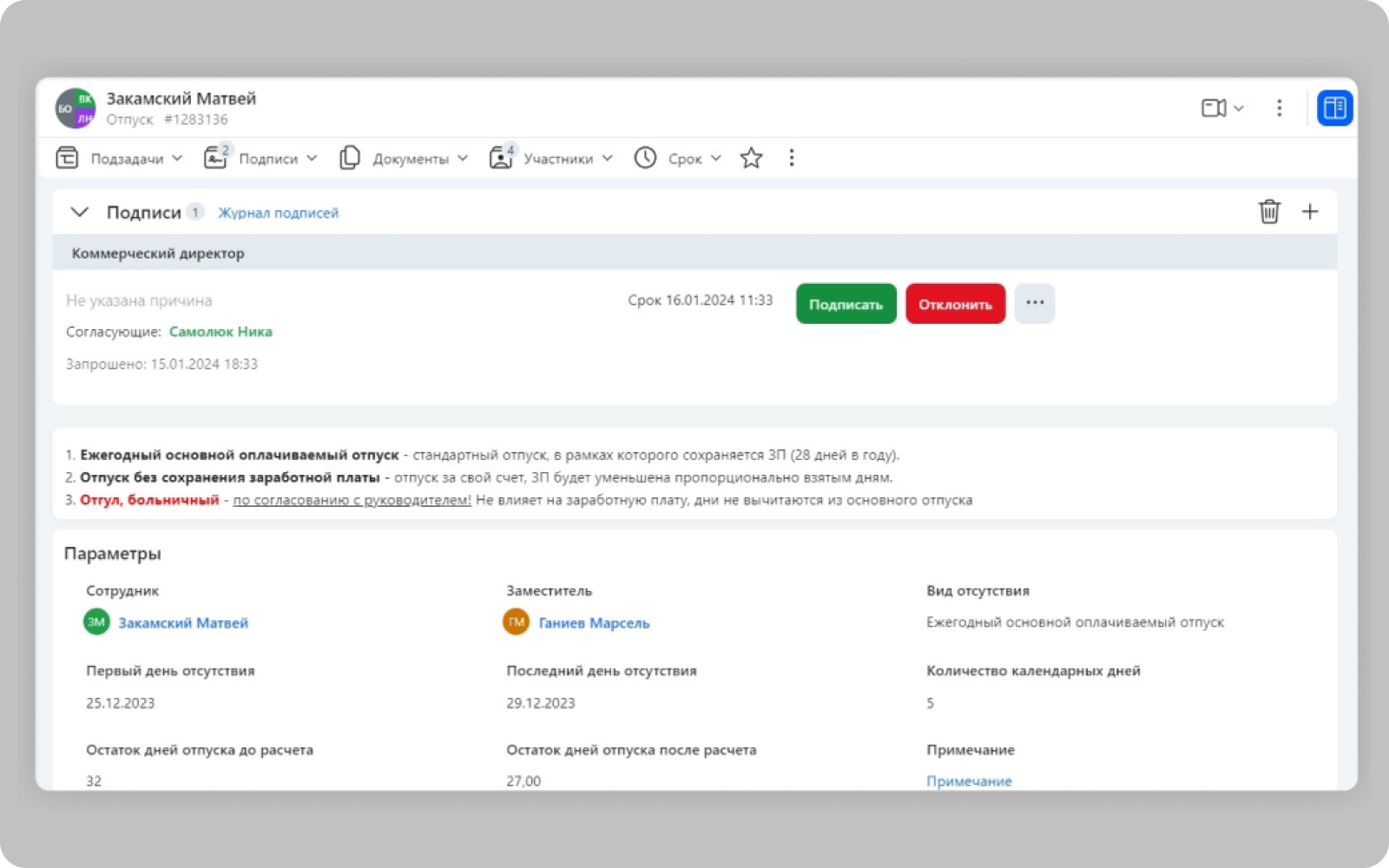 Сюда входит получение нужных справок и документов, запуск кадровых процессов, управление отсутствием, оформление командировок.